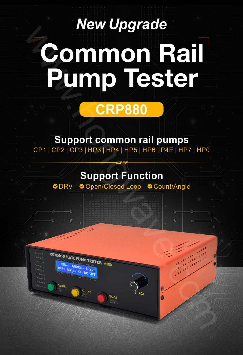 CRP 880 Pump Tester is a professional electronic tool designed to test and drive high-pressure diesel common rail pumps. It works by generating ECU-like control signals that allow the pump to operate outside the vehicle, helping technicians analyze pump performance and faults.