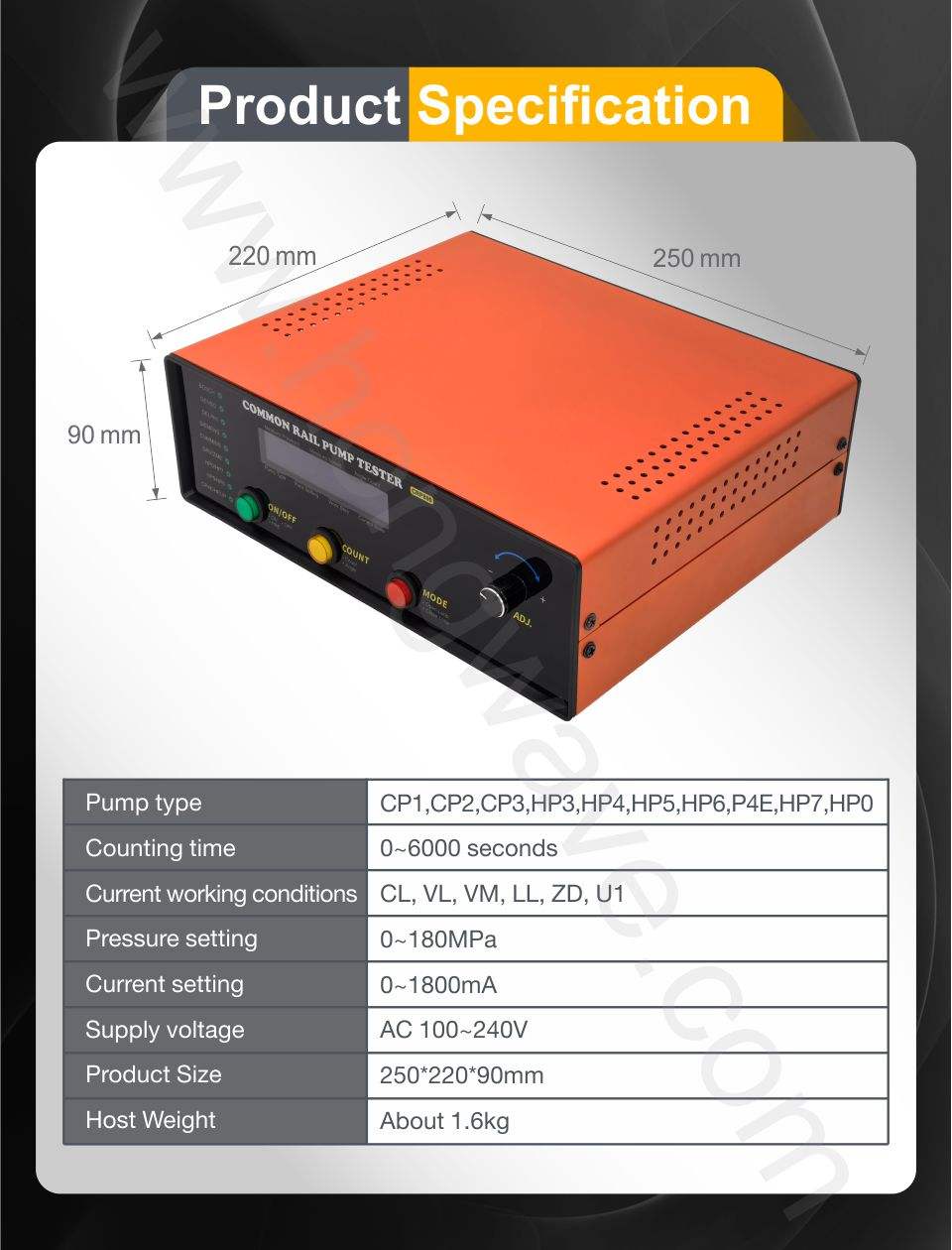 This tool is commonly used in diesel workshops for pump diagnosis, repair verification, and injector system testing setups.