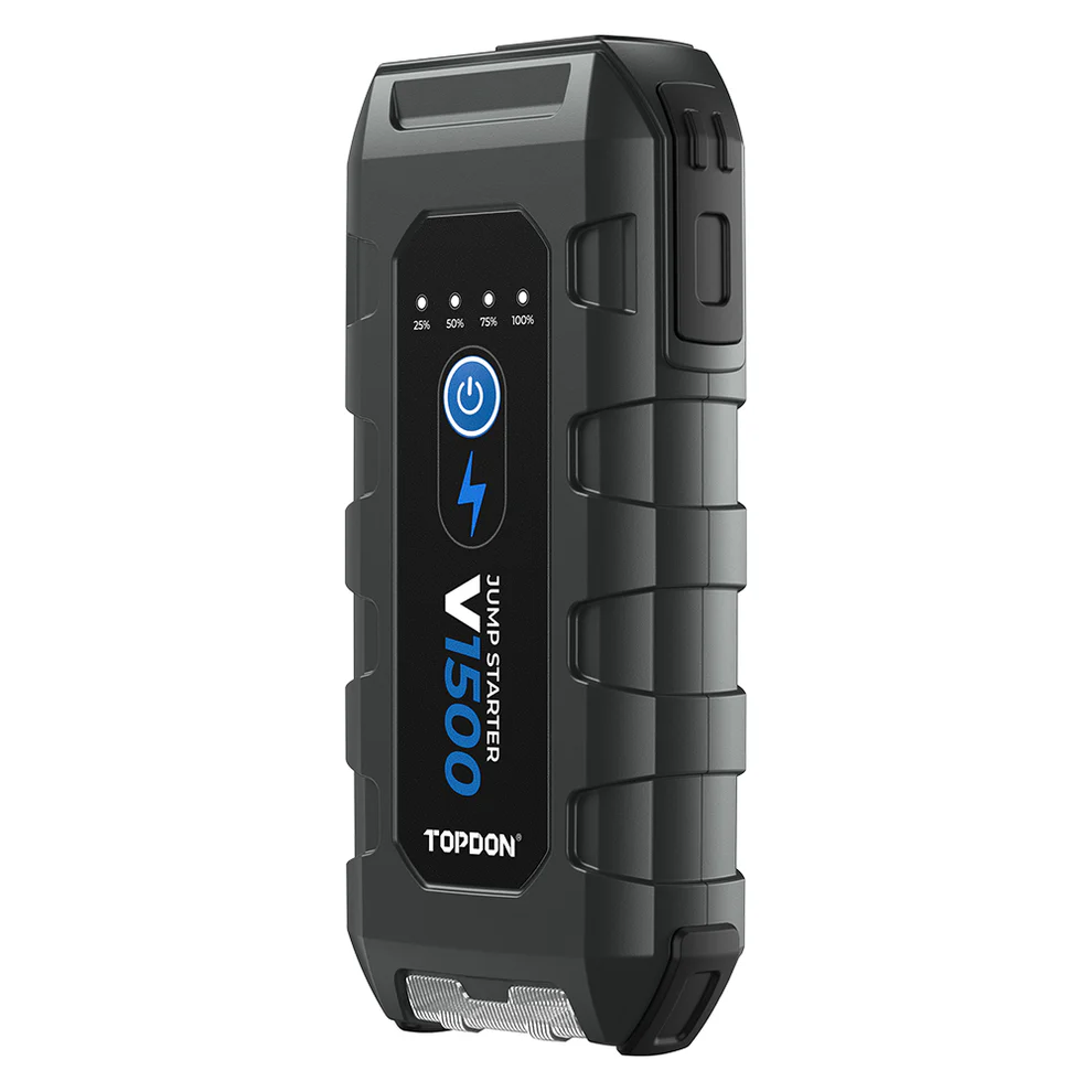 The TOPDON V1500 is a portable and efficient jump starter built for quick and safe vehicle starting. With a peak current of 1500A, it can easily jump-start 12V batteries for cars, motorcycles, boats, and trucks. It supports engines up to 6.5L gasoline and 4.0L diesel, making it suitable for most passenger vehicles.