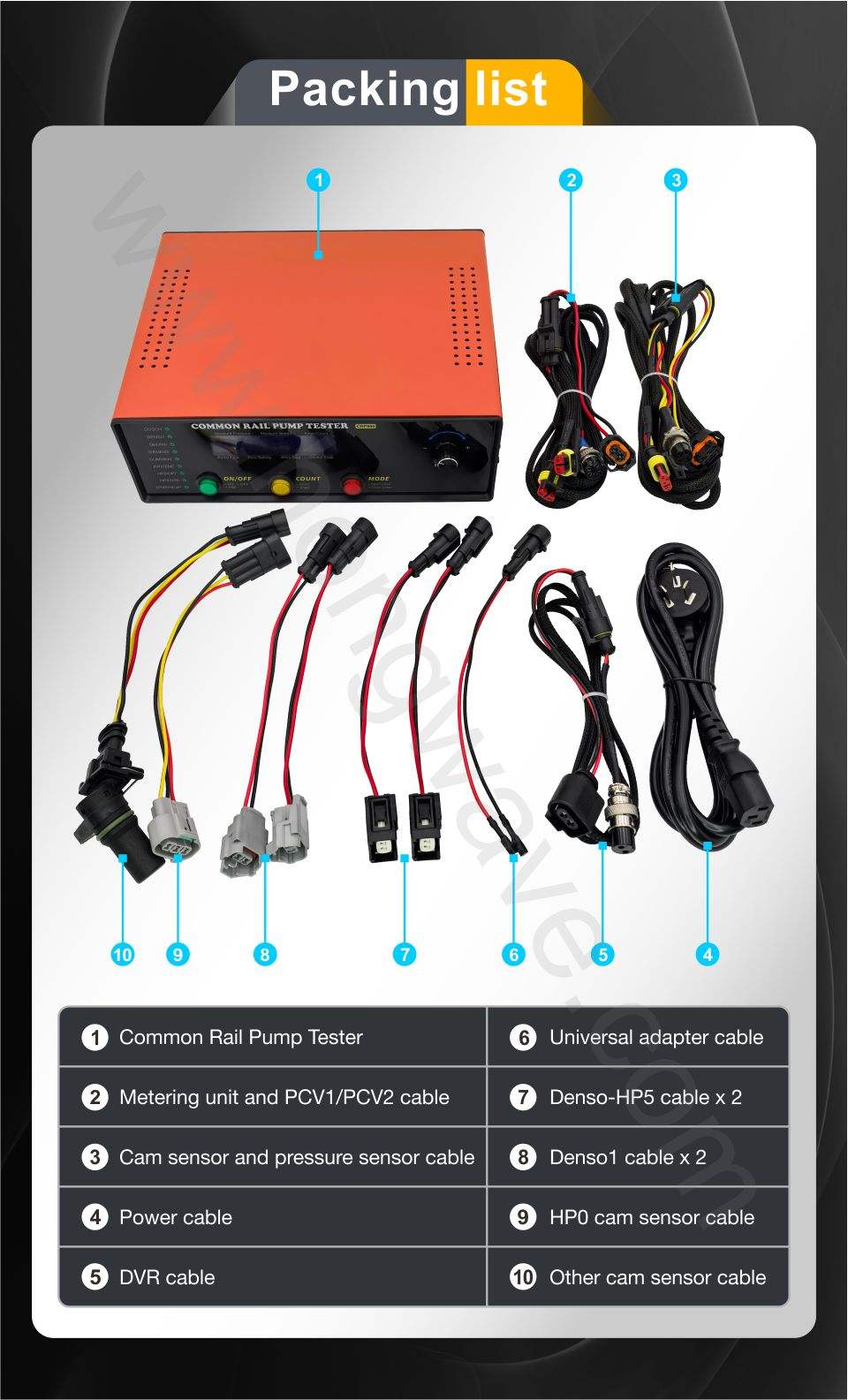 The device supports major pump types such as Bosch CP1, CP2, CP3, Denso HP0/HP3/HP4, and Delphi systems, making it suitable for a wide range of CRDI engines. It allows users to adjust and store drive parameters, enabling testing under different working conditions.