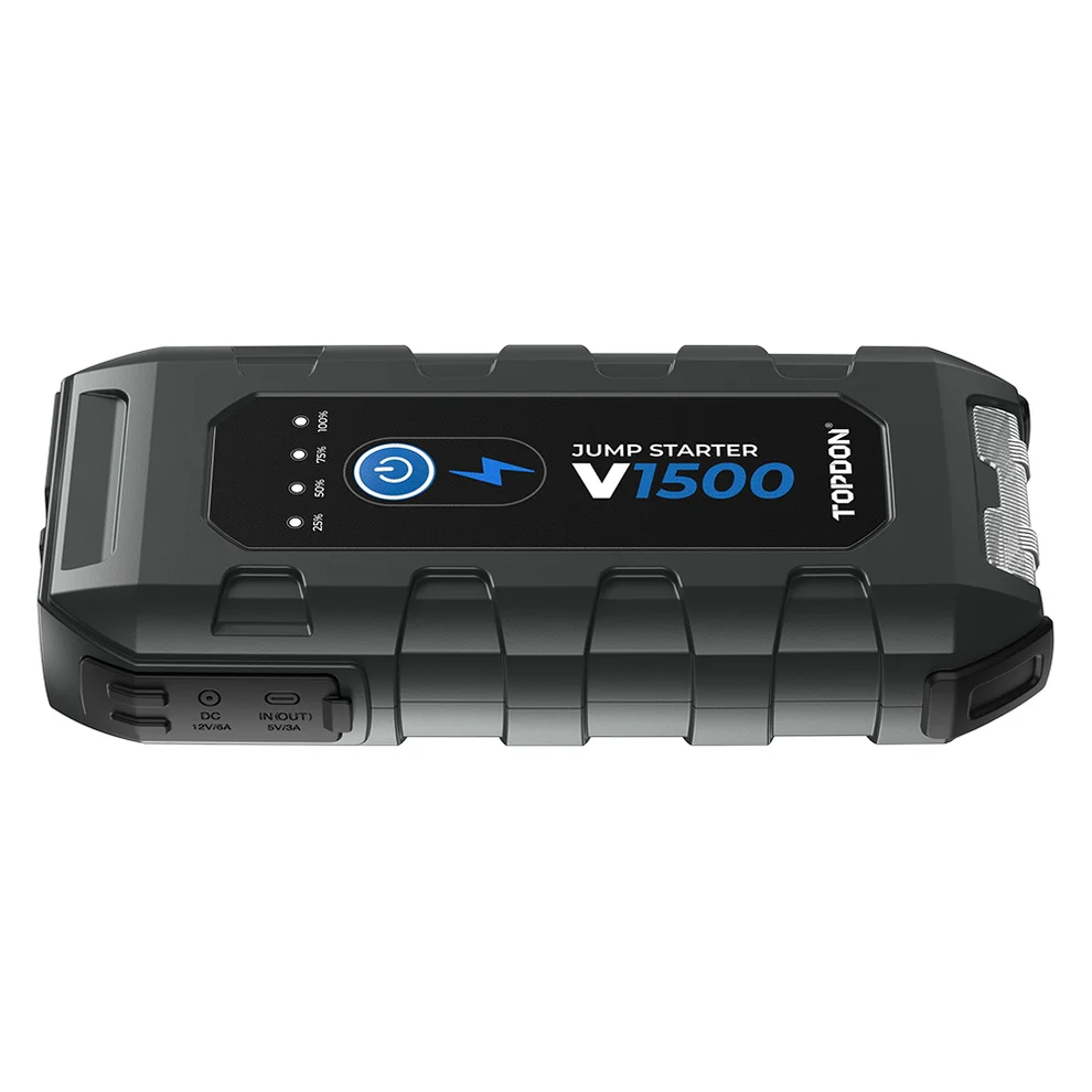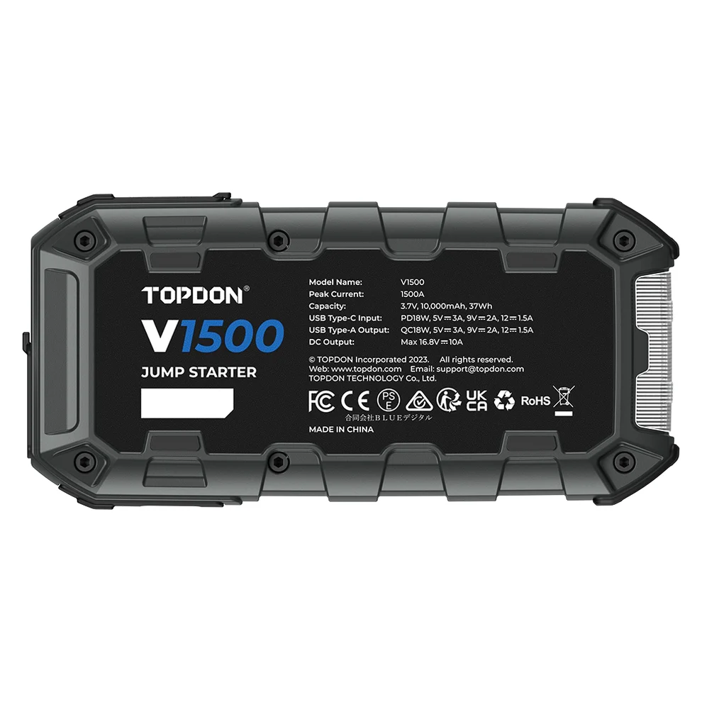 The TOPDON V1500 is a portable and efficient jump starter built for quick and safe vehicle starting. With a peak current of 1500A, it can easily jump-start 12V batteries for cars, motorcycles, boats, and trucks. It supports engines up to 6.5L gasoline and 4.0L diesel, making it suitable for most passenger vehicles.